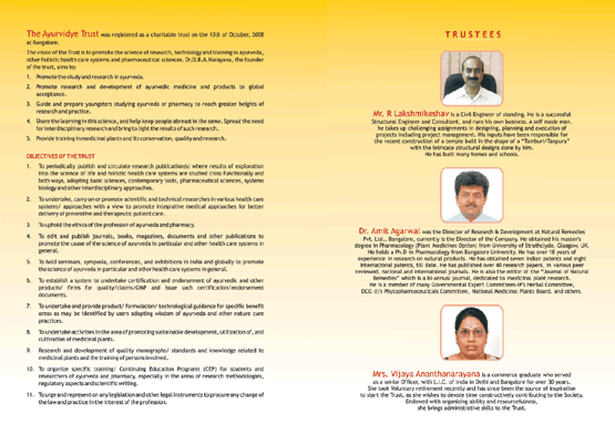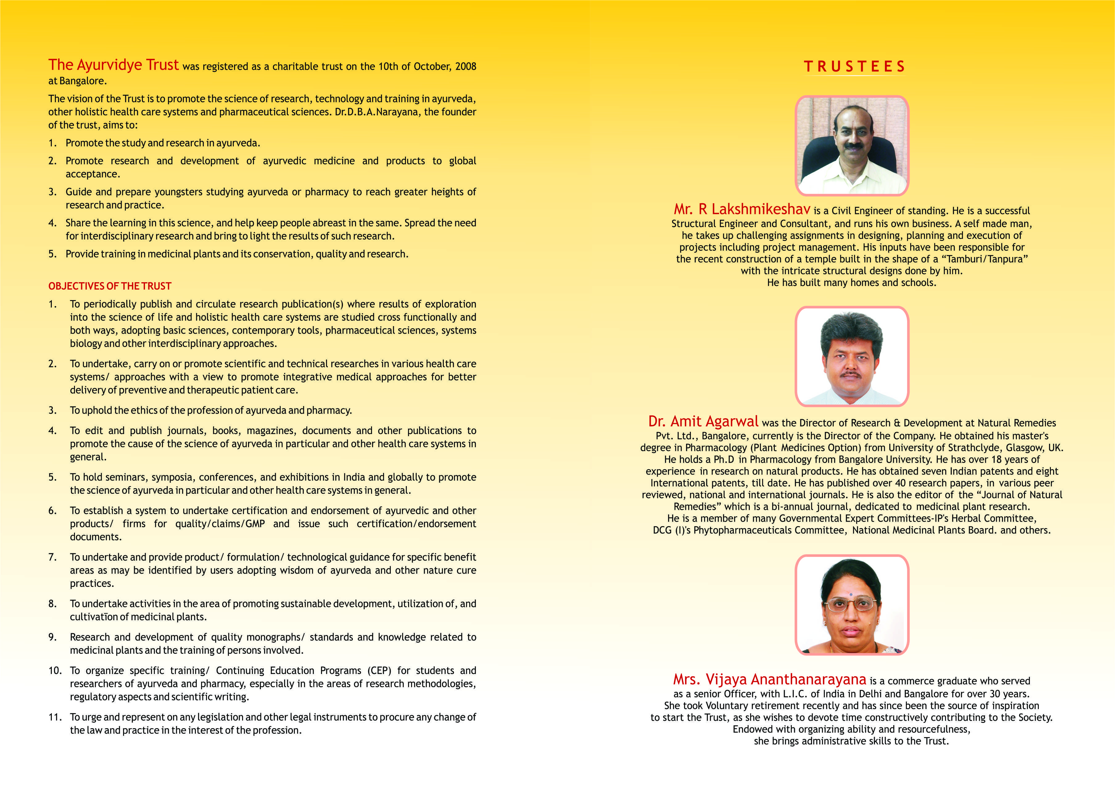 Mr R Lakshmikeshav (well known structural engineer, architect and consultant), Dr. Amit Agarwal (Director, M/s Natural Remedies Pvt Ltd, CEO, M/s Herbartizan) and Mrs. Vijaya A Narayana (retired AO, LIC of India) are the Trustees.